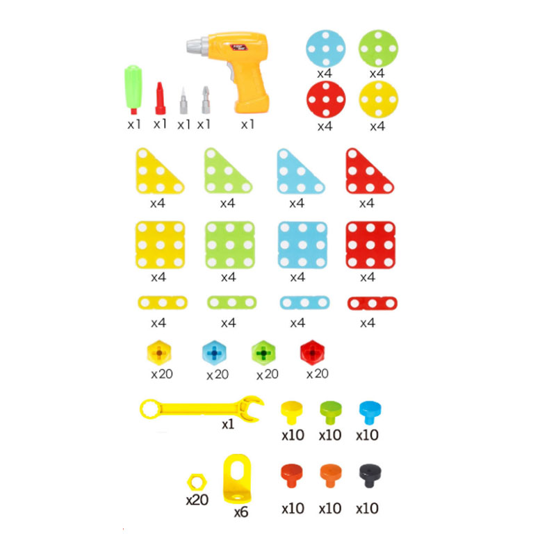 Including interchangeable drill bits, reversible electric drill (requires 2 AA batteries, not included), chunky plastic nuts and bolts, screwdriver, screw, wrench, instructions with 43 patterns, storage bag, portable design carrying case