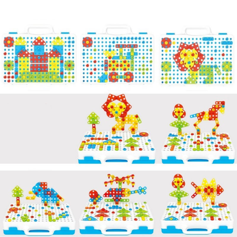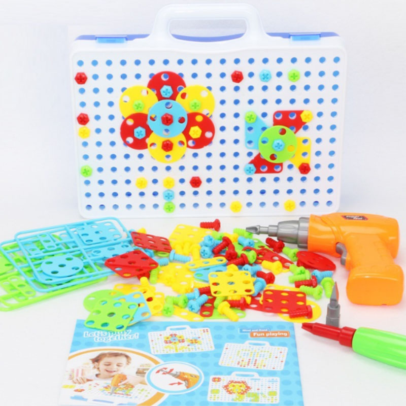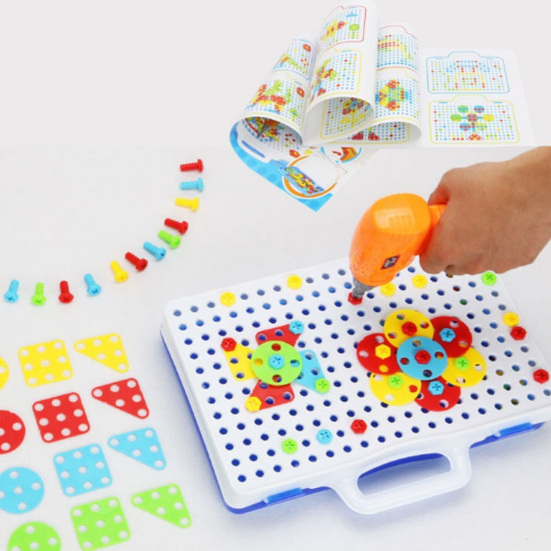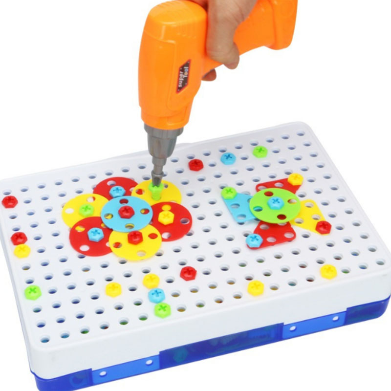 Kids can use the electric drill and screwdriver assembling the plates onto the base grid to build 2D and 3D crafts like lion, truck, butterfly, flowers, bird, helicopter, etc