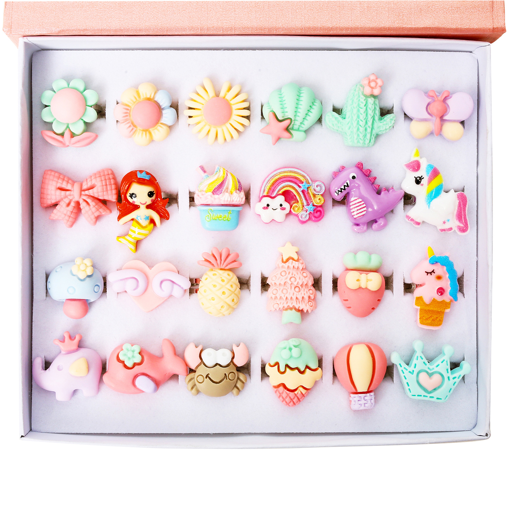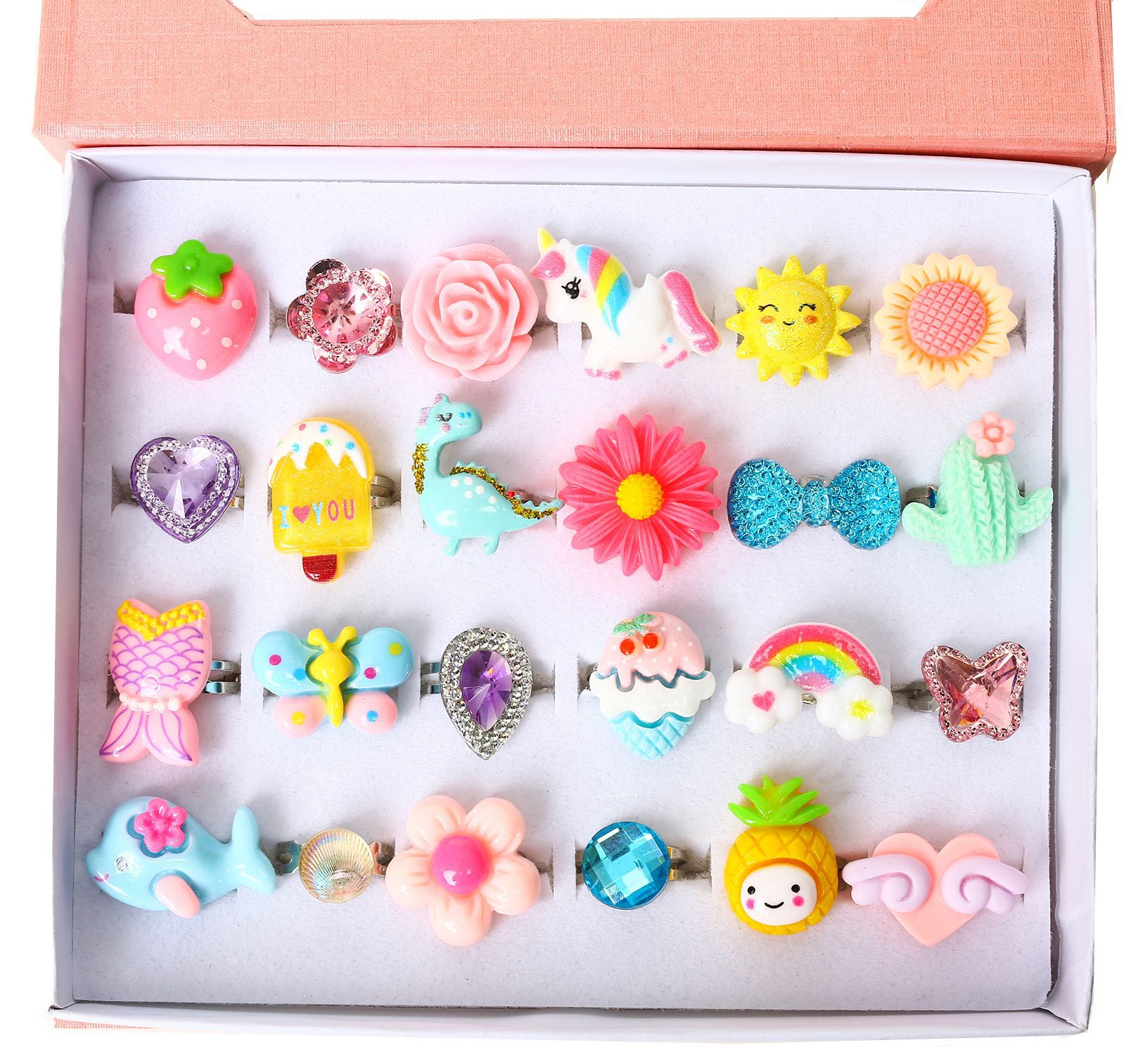 Every little princess deserves a box full of magic! This 24-piece adjustable ring set