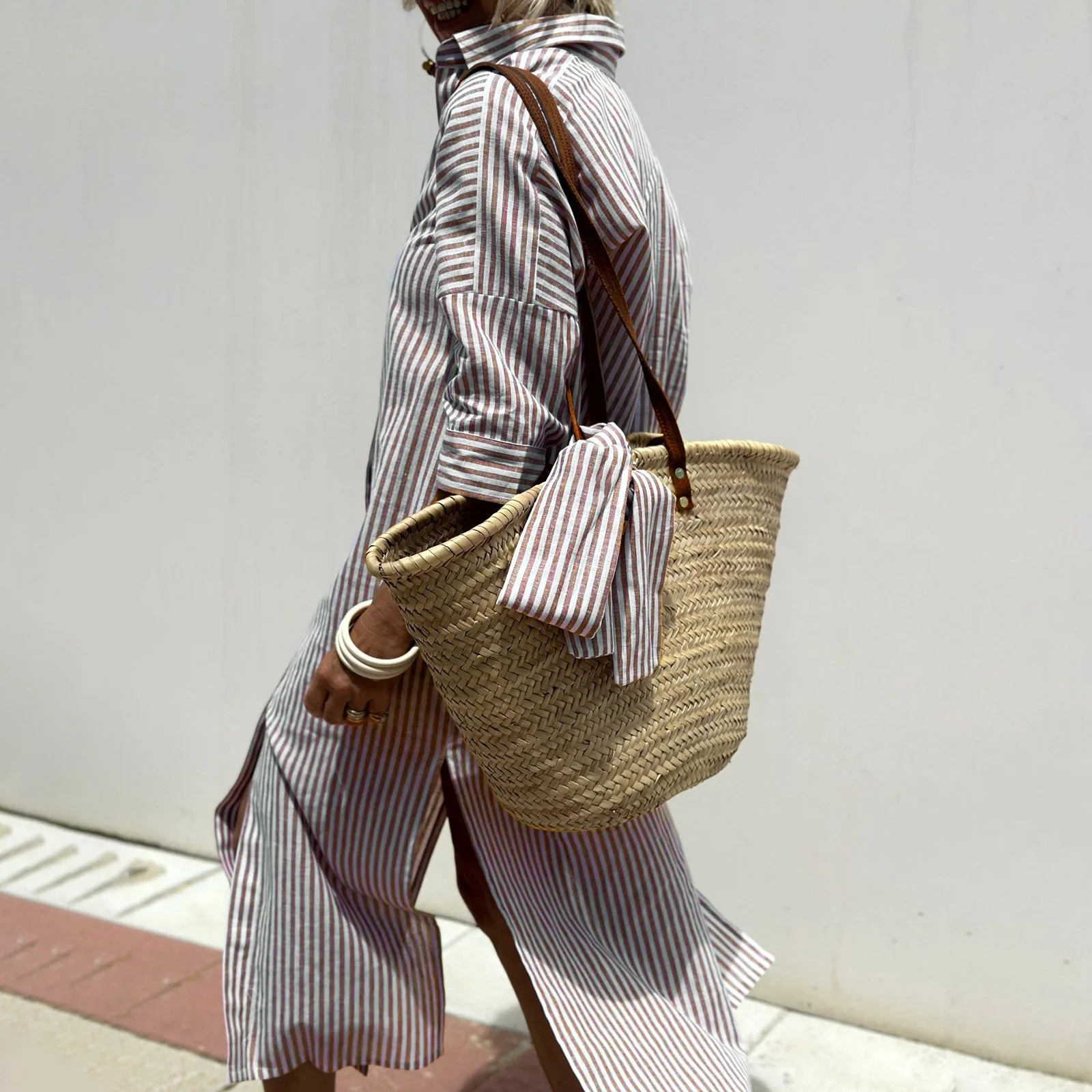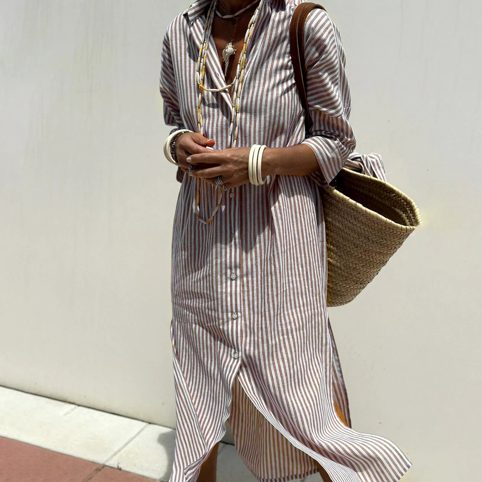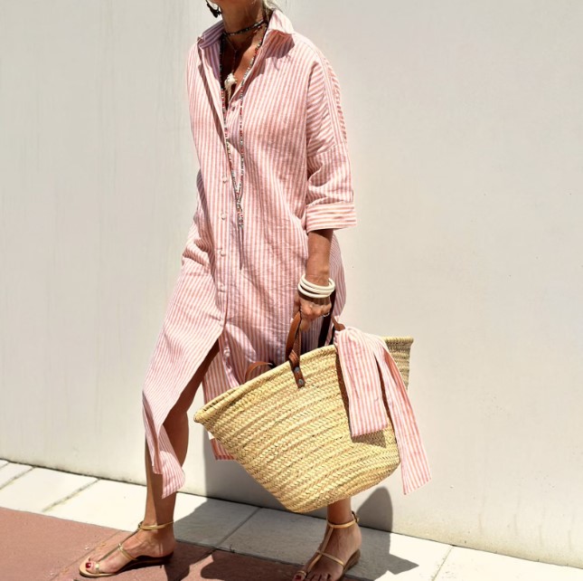Step into effortless elegance with the Elbow Sleeve Stripe Lapel Shirt Dress, a versatile piece that combines classic shirt styling with modern charm. Featuring a flattering lapel collar, elbow-length sleeves, and a waist-defining belt, this dress is perfect for work, casual outings, or weekend gatherings.