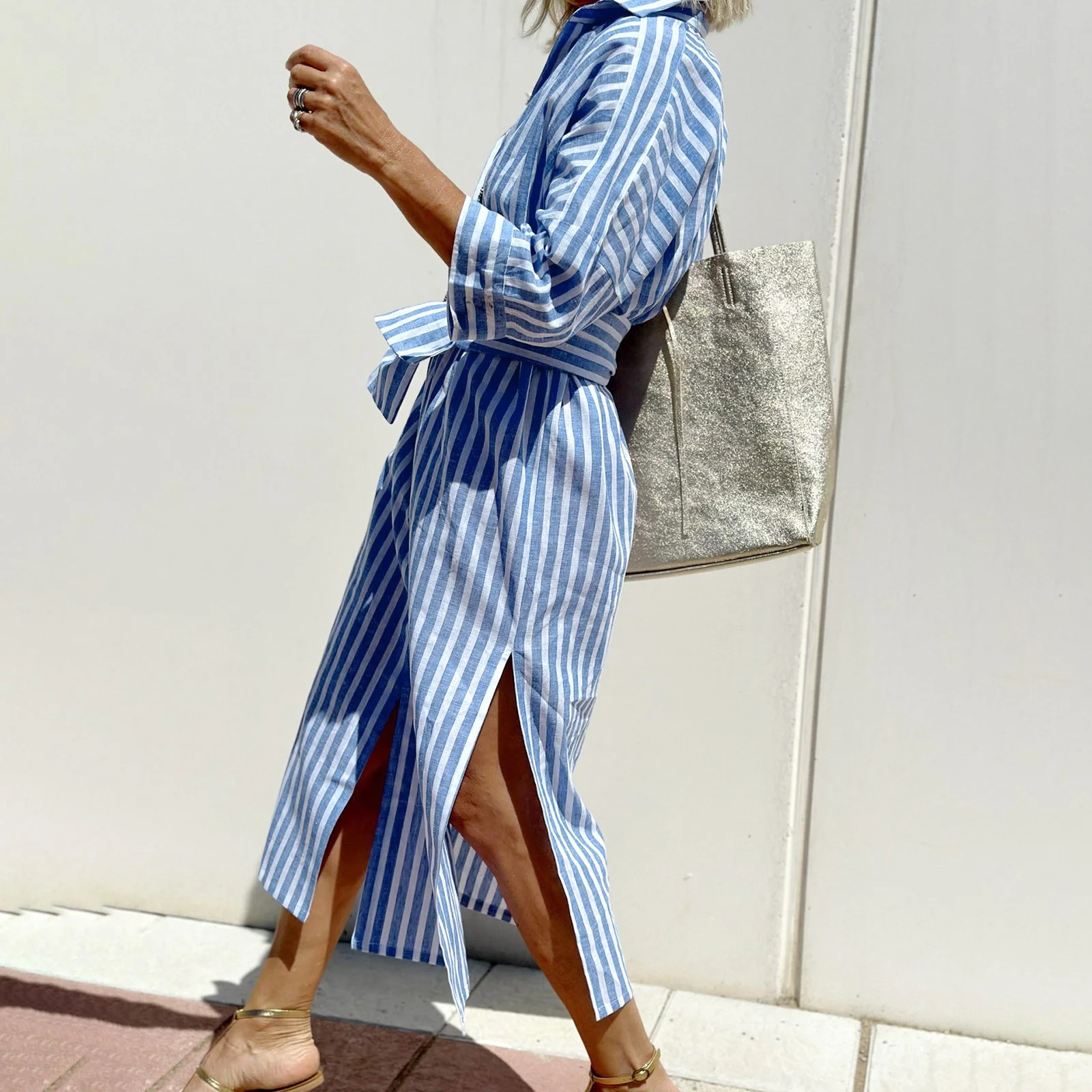 ? Elbow Sleeve Stripe Lapel Shirt Dress with Belt – Chic, Comfortable & Timeless