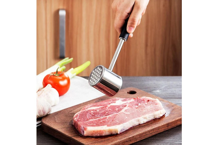 This double-sided meat mallet features a flat surface
