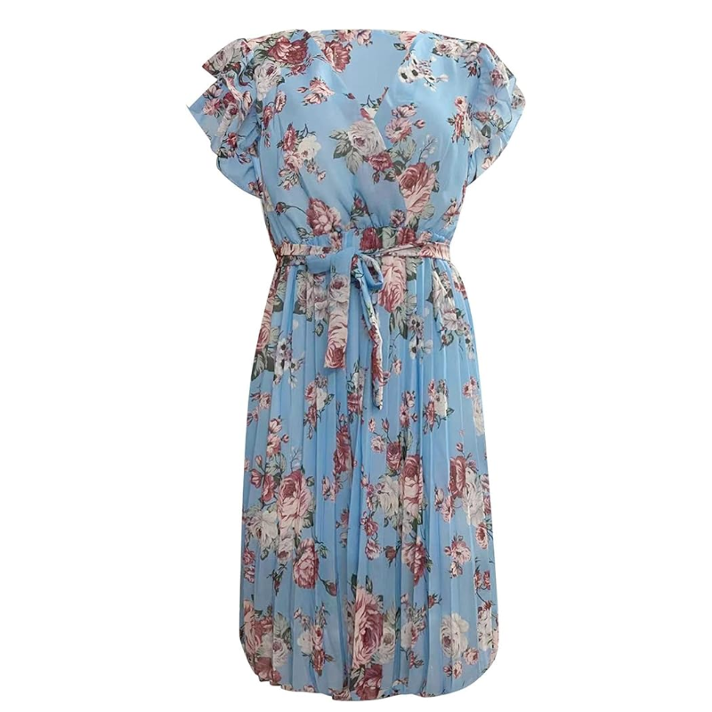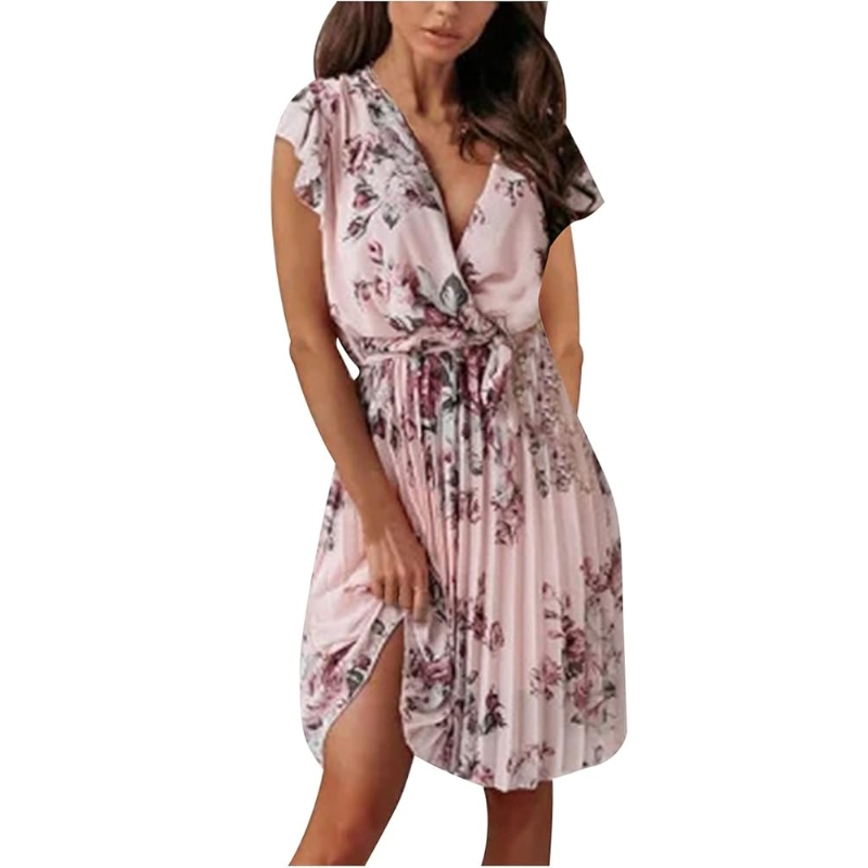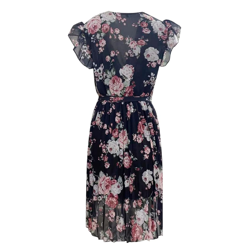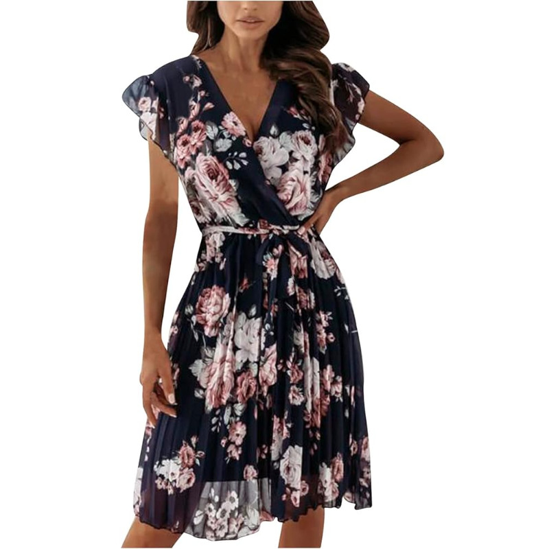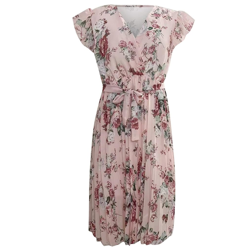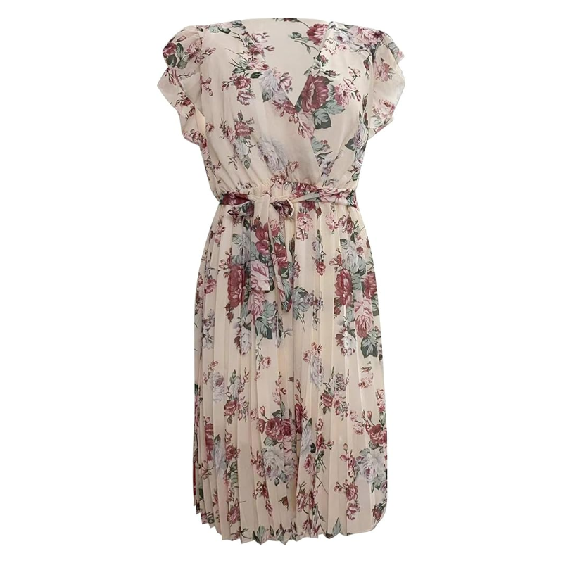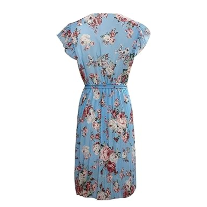 Ruffled Sleeves V Neck Printed Pleated Skirt